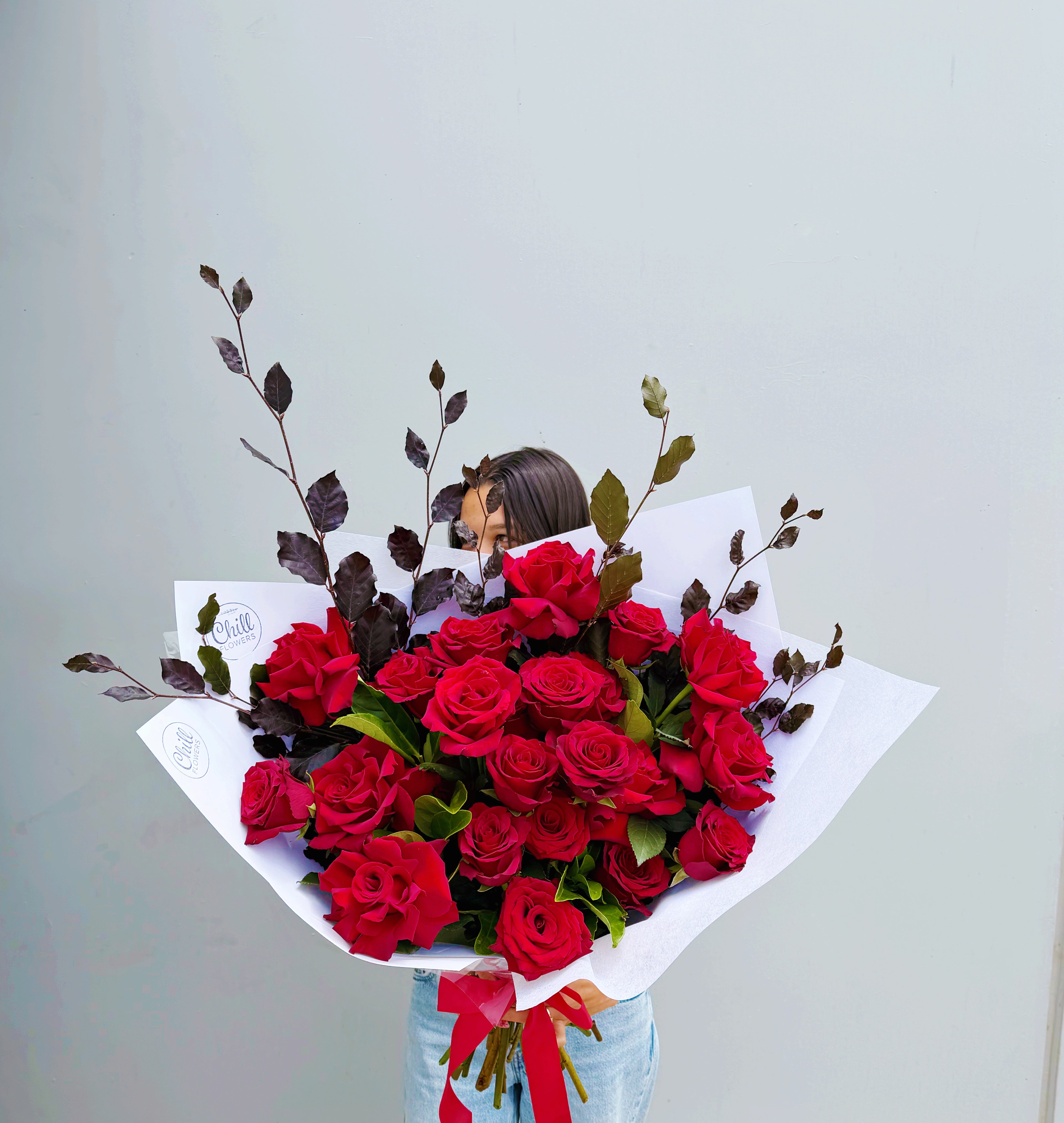 Grade A premium Long stemmed deep velvet red Ecuadorian roses with a lush foliage base -  Beautifully gift wrapped and tied with signature ribbon
